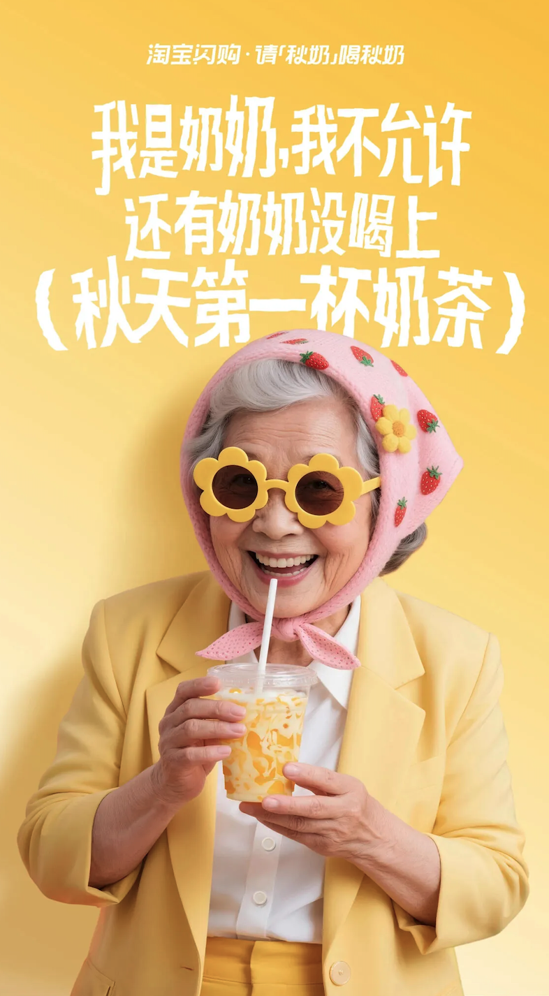 Above is the example of a Taobao Autumn Milk poster says, “I’m a grandma, and no grandma misses the first autumn milk tea.” It’s for the Double Nine Festival, a time to honor the elderly. Taobao even ran short videos and posts introducing seniors with captions like “See the old treasures, discover new wisdom,” (看见老宝贝,淘到新智慧). Taobao didn’t focus on selling products but the idea that elders are valuable, vibrant, and worth celebrating, making the platform a hub for memorable emotional stories.