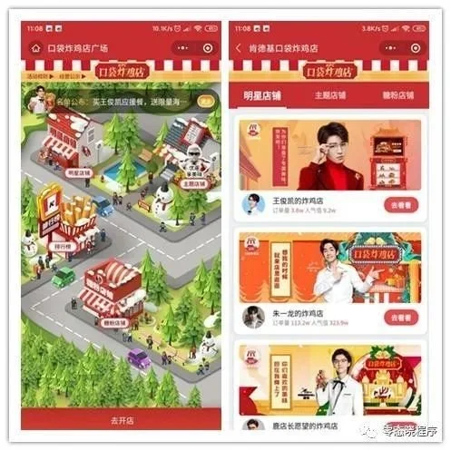 Another example is KFC. If you find distribution and fan economy outdated, it's likely you haven't used them well. KFC has found the way to connect with fans via gamification. Below the mini program displays the four major sections in 2.5D, which are celebrity stores (stores based on Intellectual Property (IP) of popular celebrities), themed stores (KFC branding stores), follower stores (user’s friends’ stores), and leaderboard (ranking of popular fried chicken stores).