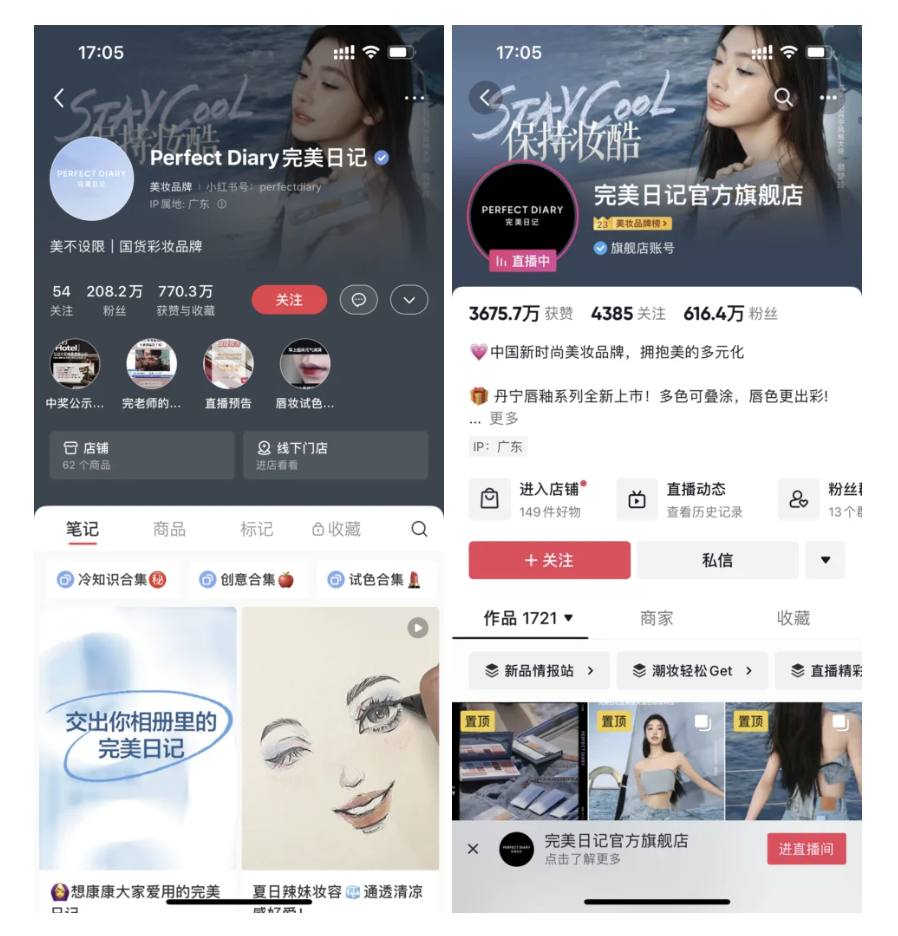 Images of Perfect Diary’s Red and Douyin homepages show online store entries and livestream access. They use Douyin for engaging content, Red and Weibo for audience reach, and Tmall and JD.com for direct sales.